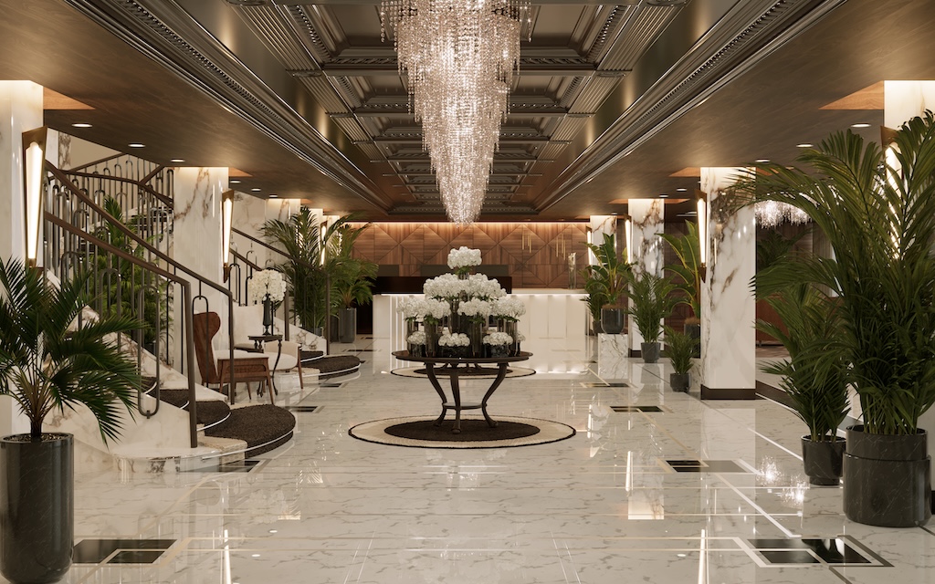 The Olympic Hotel’s interior design redefines elegance in the grand lobby and reception area. With ornate columns, intricate moldings, luxurious marble flooring, opulent furnishings, sumptuous textiles, and exquisite detailing, the space exudes timeless sophistication. Symmetrical arrangements, classical motifs, and grand chandeliers add harmony and warmth, creating an inviting atmosphere.